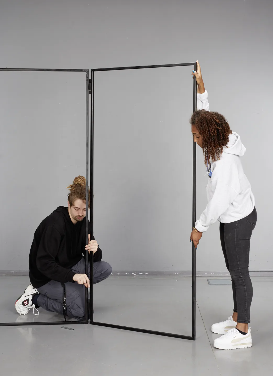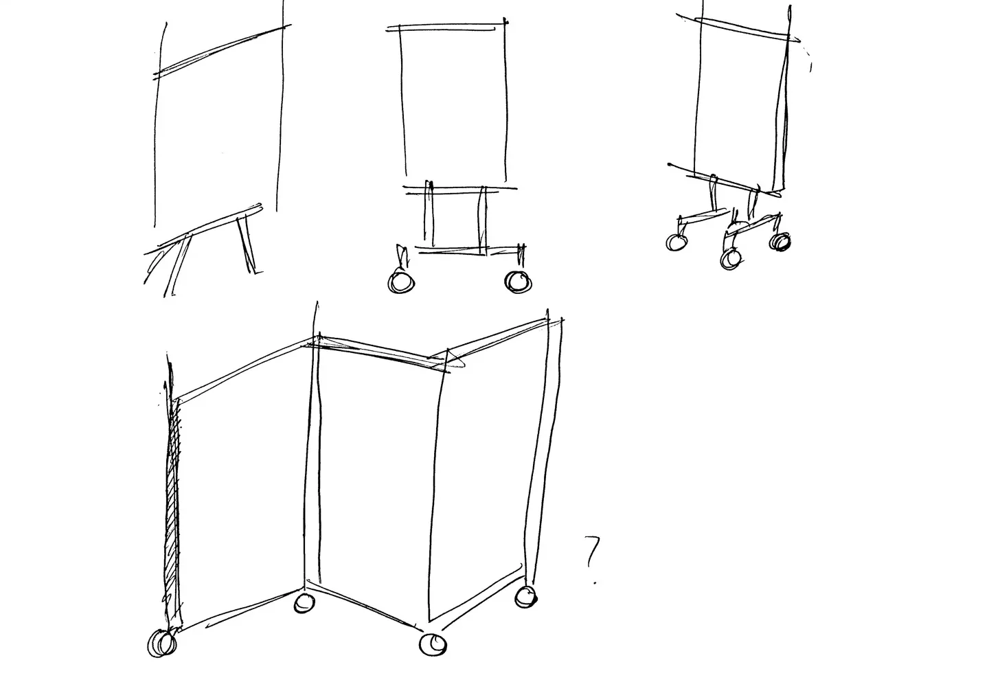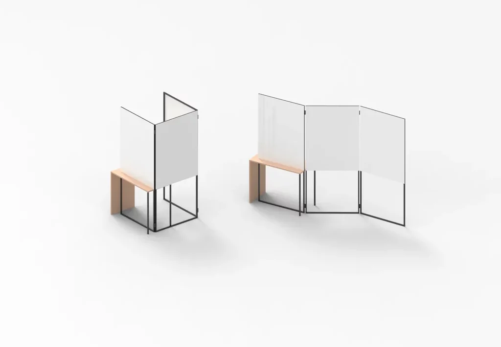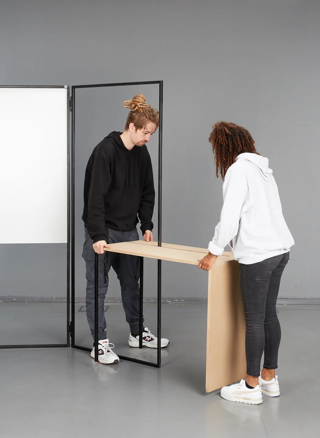 The bolt and hinge system allows for easy assembly of the frames. The partition consists of modular frames. Composed of whiteboard and table, these can be taken apart. The table has a slot so it can be slid into the frames to help stabilize the overall partition construction. The frame has 3 primary components. One wing on the left with four hinges and another on the right with two hinges. These are connected with a center piece, which can be supplemented with more to extend the partition.