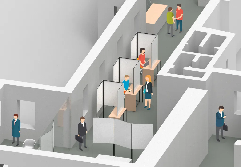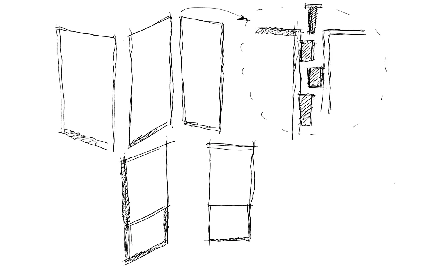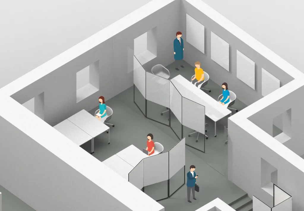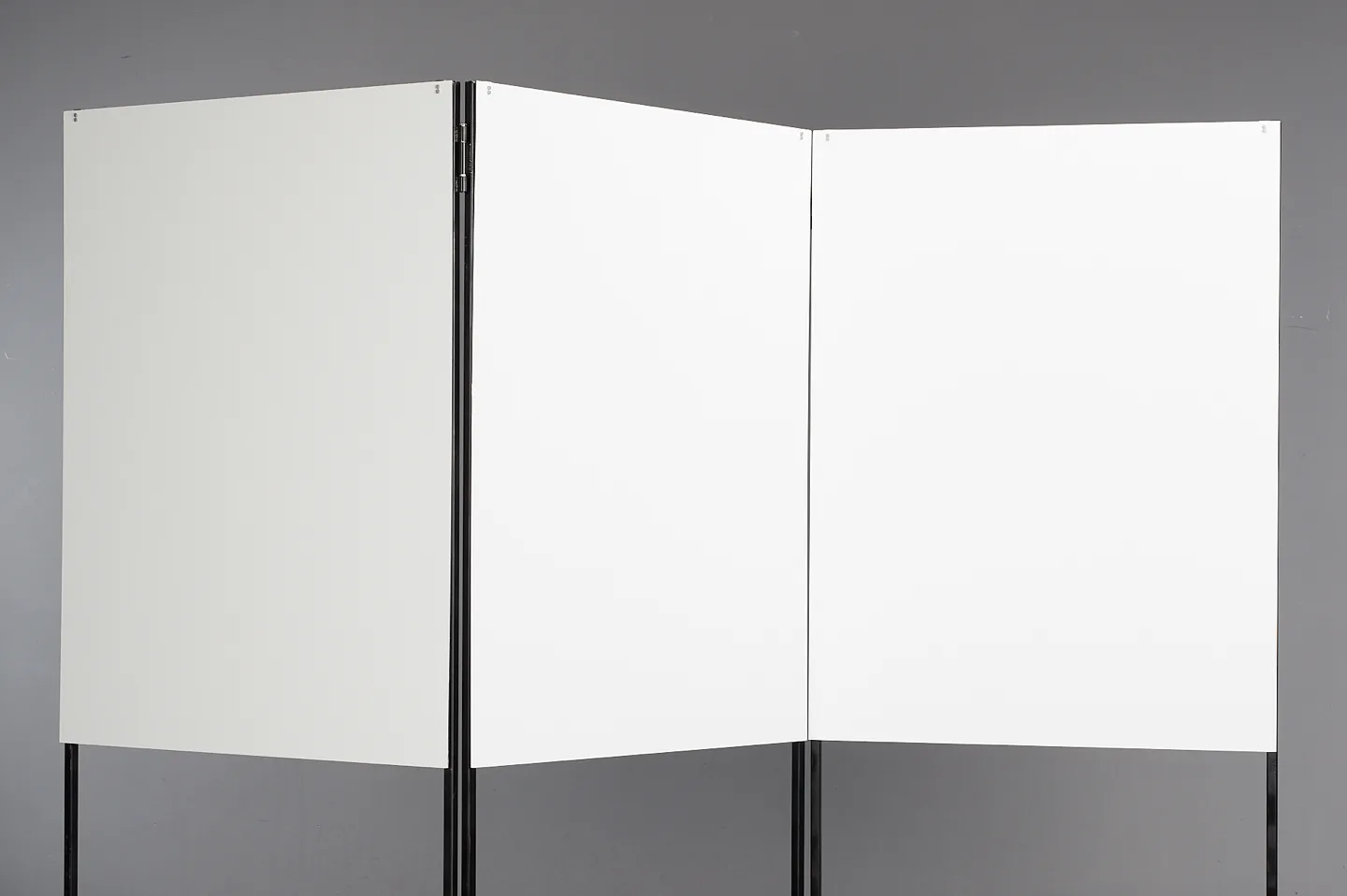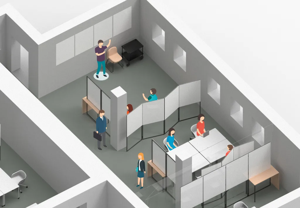 The bolt and hinge system allows for easy assembly of the frames. The partition consists of modular frames. Composed of whiteboard and table, these can be taken apart. The table has a slot so it can be slid into the frames to help stabilize the overall partition construction. The frame has 3 primary components. One wing on the left with four hinges and another on the right with two hinges. These are connected with a center piece, which can be supplemented with more to extend the partition.