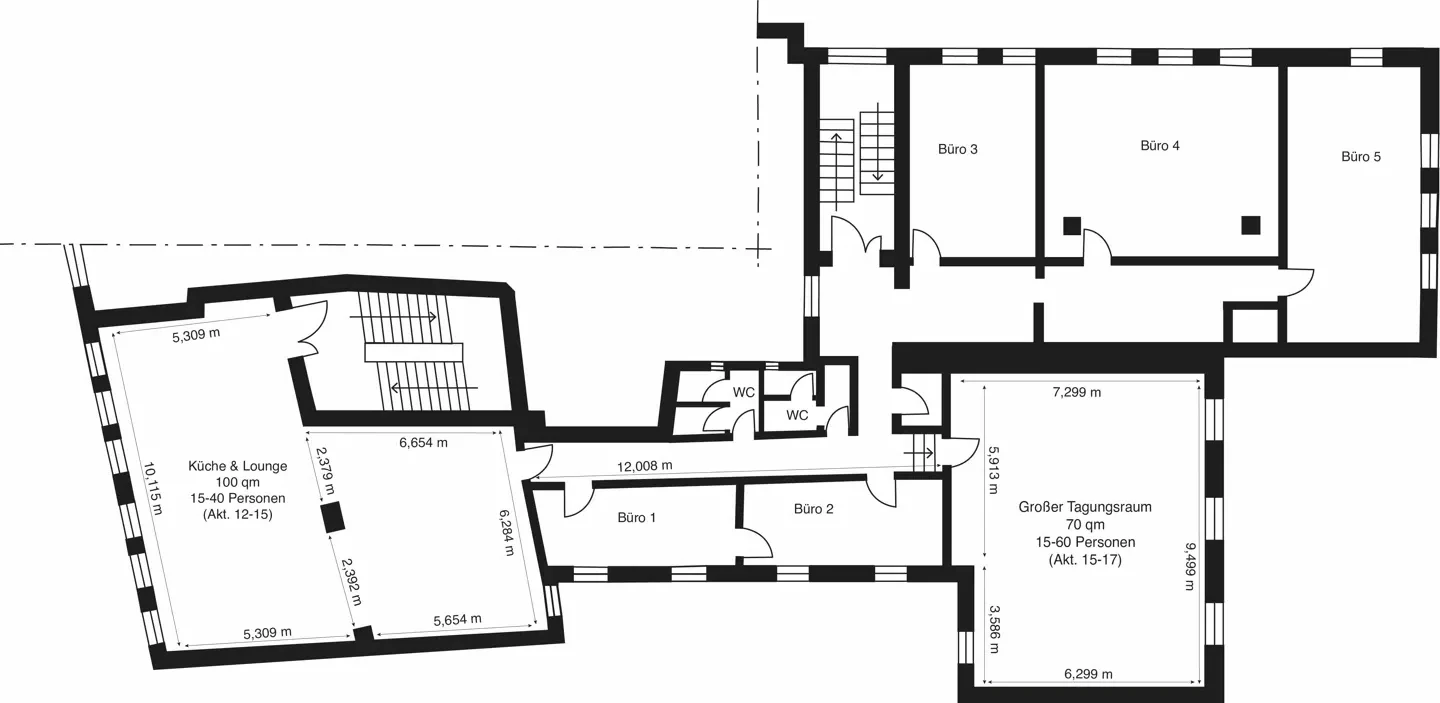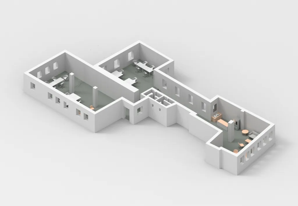 The room concept, I took an existing room in Erfurt as the starting point. The building is currently part of the Krämerloft Erfurt Coworking Space. The space is located near Erfurt‘s main train station at Bahnhofstraße 15. An ideal location for coworking space, as it is centrally located and therefore easy to reach. I divided the rooms according to their different functions based on their layout. In addition, this room offers various possibilities to meet the needs of the different coworkers.