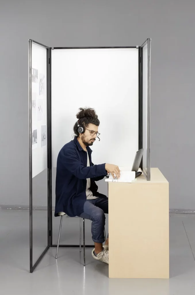 The modular frame finds its function as a partition, screen and as a small „telephone booth“. On the one hand, the table acts as a base for stabilization, on the other hand as a small work surface that can be used for video conferences.