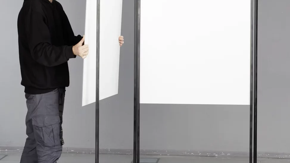 The frames were built from 20mm square tubes. Thanks to the filigree and simple construction, the frames are very easy to transport. For faster assembly and disassembly, the whiteboard is attached to the frame using a hook principle.